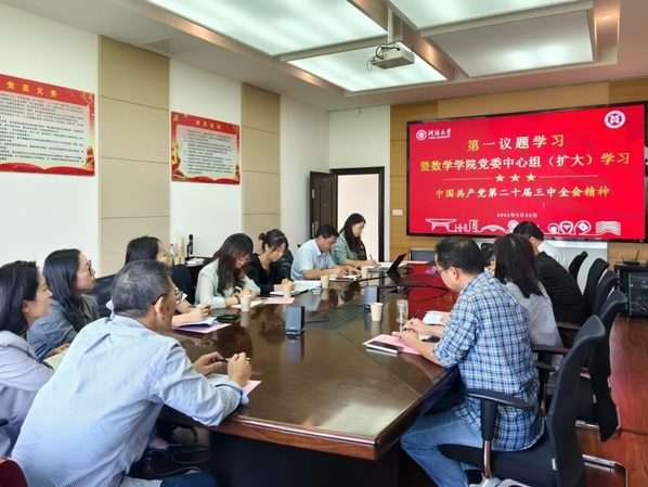 潘静书记在会上传达了党的二十届三中全会精神,她强调党的二十届三中全会,是全面推进强国建设、民族复兴伟业的关键时期召开的一次具有全局性、历史性意义的重要会议,会议审议通过的《中共中央关于进一步全面深化改革、推进中国式现代化的决定》开启了高质量发展的时代新篇。她指出,学院领导班子、党支部书记、系中心负责人要在学习宣传贯彻全会精神上走在前、作表率,将学习贯彻全会精神与学习习近平总书记关于教育的重要论述贯通起来,与学习贯彻习近平总书记关于加快发展新质生产力扎实推进高质量发展的重要论述和关于科技创新和基础研究重要讲话精神联系起来,与巩固拓展主题教育成果、慎终如始抓实抓好党纪学习教育结合起来,加快构建高质量党建工作体系,从思想、组织上引领学院事业高质量发展,进一步带动教育科技人才一体化推进的新局面,以全局观念和系统思维谋划数学学科改革发展新思路新举措,从弘扬教育家精神、培育时代新人、构建科研新范式、聚焦人才引培、夯实文化根基、深化合作交流、提高管理效能等七个方面,持续深化各项改革任务落实,助推学院高质量发展。