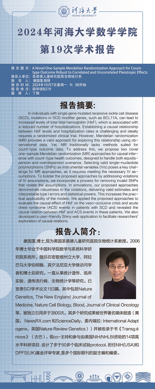 好色tv 第19次学术报告:A Novel One-Sample Mendelian Randomization Approach for Count-type Outcome Robust to Correlated and Uncorrelated Pleiotropic Effects