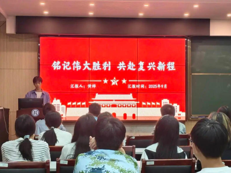 会议第二项,毕业班党员黄烨同志以“铭记伟大胜利,共赴复兴征程”为主题进行领学。他结合参阅官兵艰苦训练、英模部队荣誉战旗等感人细节,深入阐释了阅兵仪式展现的国家力量与民族精神,强调新时代青年要从中汲取奋进力量,强化使命担当。