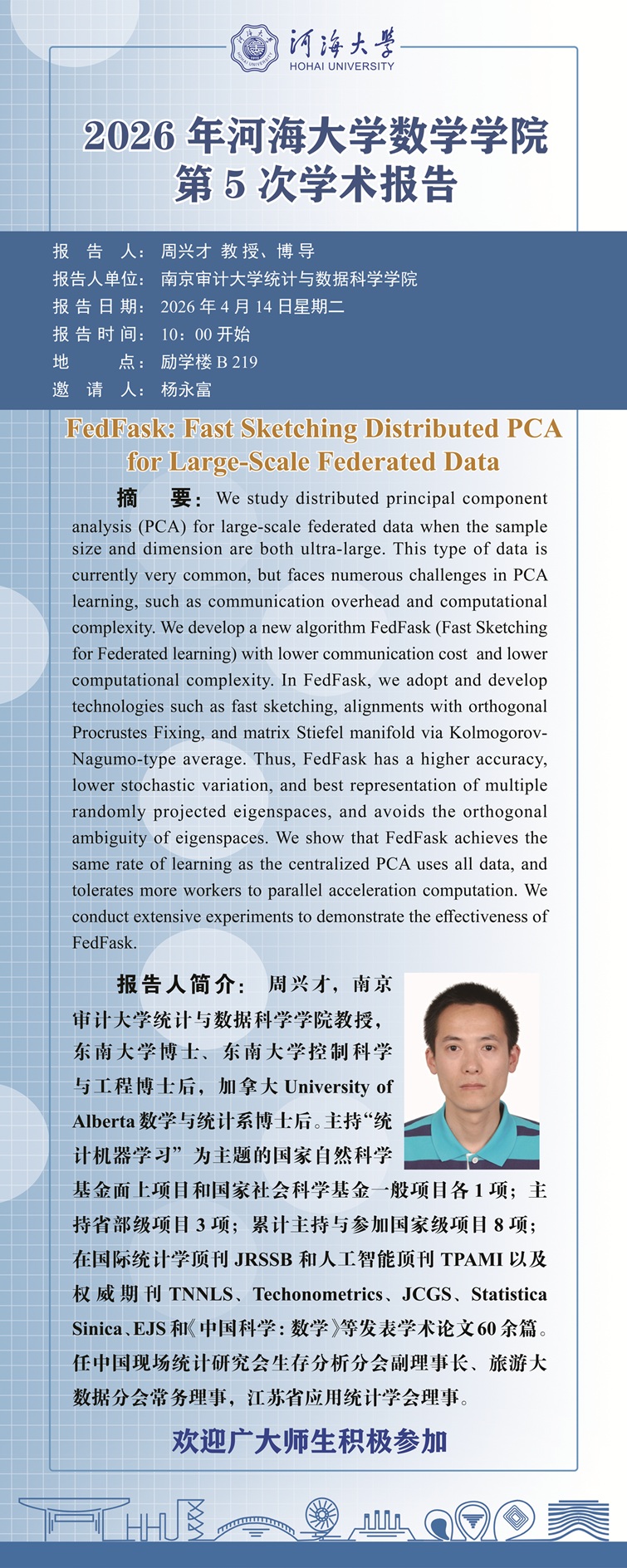 好色tv 2026年第5次学术报告:FedFask Fast Sketching Distributed PCA for Large-Scale Federated Data